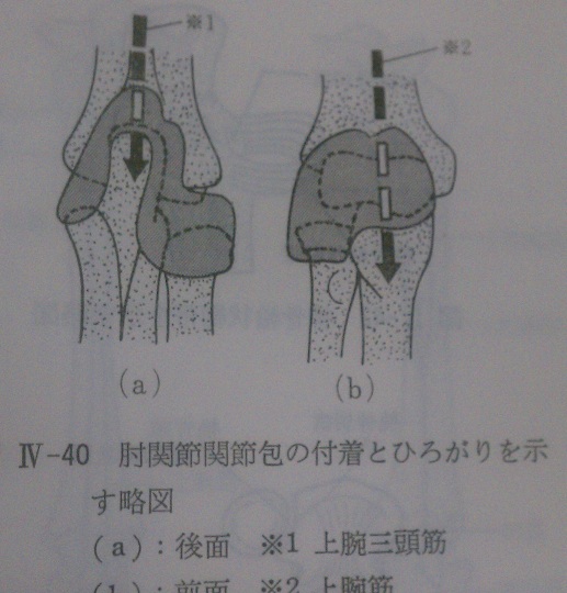 なお、緩い前面には上腕筋、後面には上腕三頭筋、肘筋の筋束の一部が着いて関節包を張り、屈伸によって前面または後面が関節腔内へ折れ込むことを防いでいる。