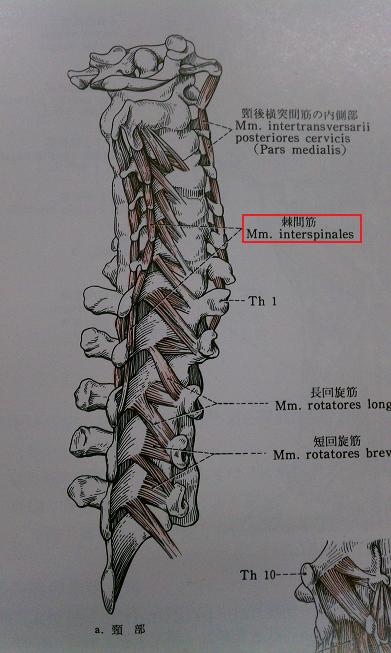 上図をみると上位頸椎の棘突起は先端が二股に分かれて、頚棘間筋はそれぞれの先端からでていますね。つまり頚棘間筋は左右1つずつあるんですね。