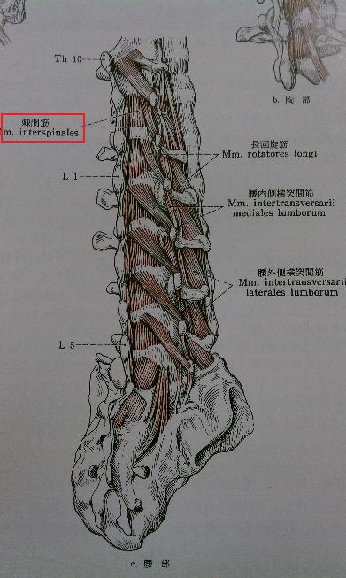 上下の棘突起間にある筋肉。部位によって頚棘間筋、胸棘間筋、腰棘間筋に分けられるが、主には頸椎と腰椎に存在する。胸椎には上・下端の椎体にのみ存在する。頚部には重複的に存在することがあり、また、ごくまれに棘突起をとびこして付着する長棘間筋がみとめられる。これを頚棘筋と呼ぶことがある。