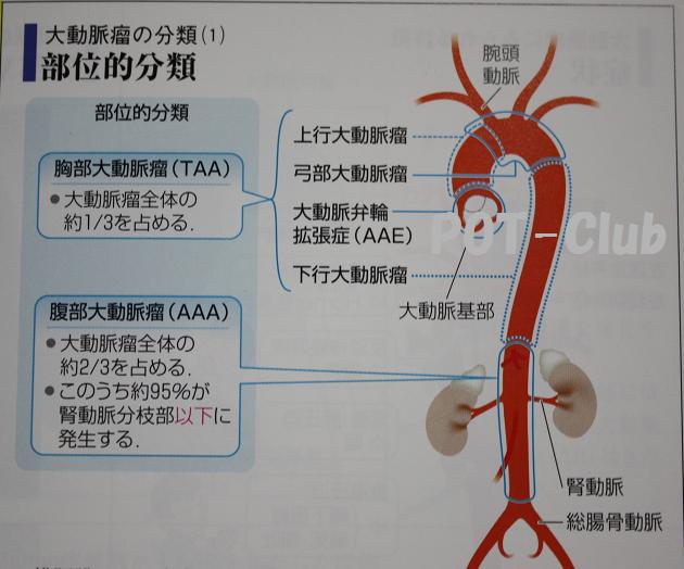 大動脈瘤の存在部位により胸部、胸腹部、腹部に分かれる。胸部ではさらに上行部、弓部、下行部に分かれる。胸腹部では腎動脈より上部、下部に分けられるが、多くは腎下部に生じる。
