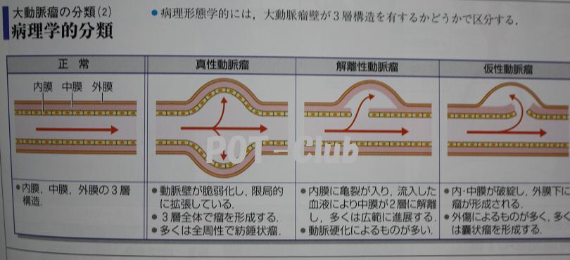 - ①真性動脈瘤:大動脈の瘤壁が3層(内膜・中膜・外膜)から成るもの。但し、瘤壁の一部で三層構造の全てが見られない部分があってもよい。