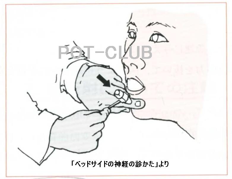 「え」と発音するように軽く開口させ、下顎を検者の左の母指あるいは示指で押さえ、検者自身の指の上をハンマーで叩くと両側の咬筋(三叉神経支配)の収縮が起こり、下顎が上昇する。この反射は正常ではほとんどみられないもので、明らかに認められるときは亢進と判定する。(これは三叉神経がその運動核より上で障害されていることを示すもので、橋の三叉神経核より上に障害があることを意味している)上肢の反射が亢進している場合には、必ずおこなうようにする。