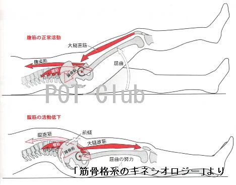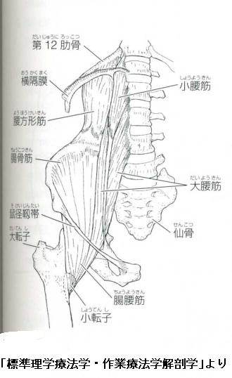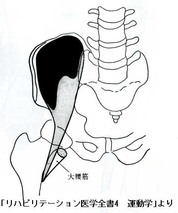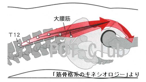 同様に解剖学的肢位において矢状面から骨盤、腰椎におよぶ大腰筋をみると、大腰筋の各椎体への力線はL5-S1では椎体の運動点より前方を通り、効果的な屈筋として作用することが考えられる。しかしL1へ近づくほど力線は椎体の運動点より後方へ偏位していき、椎体の屈曲・伸展作用はなくなっていくと考えられる。つまり屈伸運動を起こす作用がなくなるかわりに、動こうとしたものを元のアライメントへとどめる働き(安定化させる)があると考えられる。