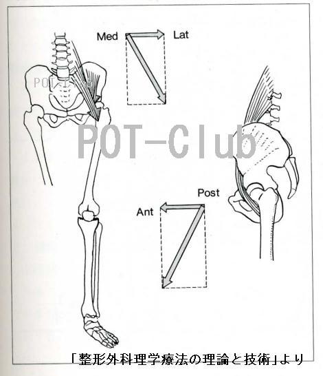 作用:強力な股関節屈筋である。骨盤に対する大腿骨の屈曲、外旋。大腿骨に対する骨盤の屈曲