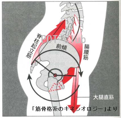 大腿骨を固定した状態では腸腰筋は骨盤前傾の作用を持つ。この骨盤前傾は股関節屈筋群と脊柱伸筋群の間の対の力(force-couple)によって起こる。筋の走行から股関節屈筋群(特に腸骨筋)は骨盤を前下方に引き下げる、また脊柱伸筋群は骨盤を後上方に引き上げるように働き骨盤を前傾させる。これらの関係により腰椎のアライメント、ひいては姿勢のアライメントに影響を及ぼす。